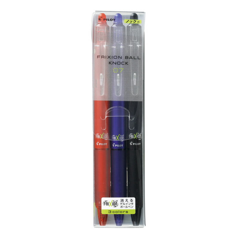 商品名 フリクションボールノック07 3色セット (消えるボールペン) 品番 LFBK-69F-3C 仕様 ●種類:ゲルインキボールペン ●インキ:フリクションインキ ●軸:PC ●ノック式(クリップスライドノック式) ●透明ケース(PP)入り 【ご注意下さい】 ※証書類・宛名書きには使用できません。