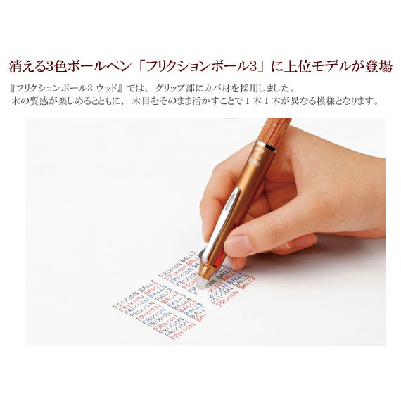 商品名 フリクションボール3 ウッド 05(消えるボールペン) 品番 LKFB2SEF 仕様 特長:1本で3色を使い分けでき、何度でも書き消し可能な利便性の高い3色ボールペン。
