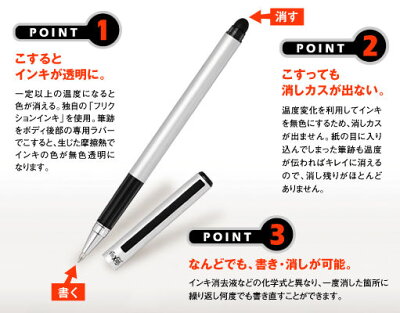 「フリクションインキ」には消色温度が設定されているため、筆跡をボディ後部の専用ラバーで擦ることで生じる摩擦熱によりインキの色が無色に変わり、筆跡を消すことができます。