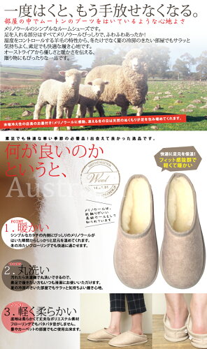 部屋の中でムートンのブーツをはいているような心地よさ! 「【オーストラリア製 メリノウール 】極上メリノン ルームシューズ」です。